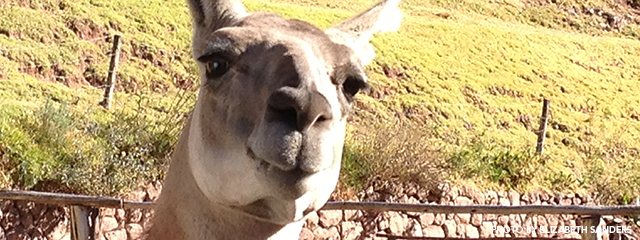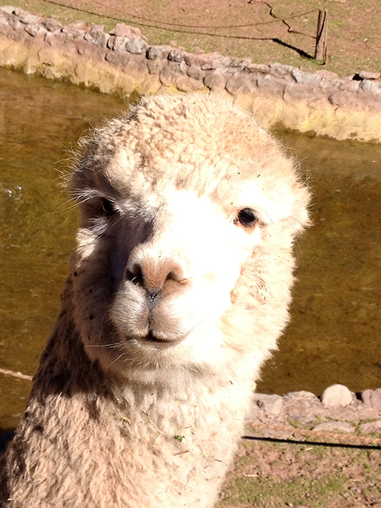 Day 9 / June 29, 2013 This morning I gathered all my things that had gotten scattered about over 7 days, packed and left my bags outside of the room before heading to the dining area for breakfast. After breakfast I said goodbye to the guides who had taken such good care of me. The boat and bus transfer went smoothly and we made it to the airport with plenty of time to have a snack before catching our flight to Cusco. We had about two hours and some of us were already hungry. The airport has a small grill there that fixes sandwiches and also sells chips and candy so it’s easy to get food, and if anyone needs help ordering the guide is available to help. If you can wait, the airline also serves a snack. On arrival Cusco we waited a bit for all the bags to be corralled and taken to the waiting bus. Hot coca tea was waiting for us as we boarded the bus. Once we got settled the bus departed, weaving through Cusco towards the Sacred Valley. Shortly after leaving we were served a box lunch. The vegetarian meal was a great pasta dish with a seasoned seitan. Seitan is wheat gluten, sometimes known as “wheat meat.” Also included were some fruit and cookies. Some might say it was too much food to ask one’s digestive system to digest considering the high altitude and low oxygen content, which slows most bodily functions — especially digestion. The ride to the Sacred Valley Camelid and wool museum was impressive and the group liked feeding the llamas and alpacas. I did too! I held on to the alfalfa so I could feel and watch them for as long as possible. I wasn’t missing any fingers; they didn’t even get close.