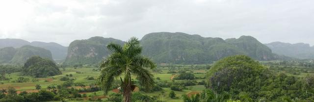 June 17: The drive today to Vinales was one incredible view after another. We were in the area of Mil Cumbres, where the hillsides were lush and full of the native royal palms, just gorgeous. The hike we did; however, was in a special area of karst topography, quite arid, and famous for a great number of endemic species. Lucia kept a great log of what we were seeing, but we couldn’t stay out there more than an hour because it was just too darn hot. We then went in search of the endangered Microcycas calocoma, which is endemic to a small area of Pinar del Rio. Well, this was quite an event. We first walked through a small (300+ people) town or village, down a road between farm homes, and were led through a gate by the owner of the land, by his pigs, and there it was – the bridge. The bridge that hung over a fast-running river that was about 20 feet wide. Well, the "bridge" was one not-so-big log. And to help you walk on this log, there was a thick cable wire that you might use for phone lines that strung that from one side to the other, wrapped around a tree on each side. The wire was rather loose, so the local guides held them; Peter gladly jumped in the water to help, and Lucia also got in the water. Not by choice at first, but just stayed in to help. I wanted very much to go across, but didn’t feel I could cross the boulders and the log without falling in, so I opted out with about five others. But the rest made it across, found 13 specimens of the cycad, and had to return the same way they came. By the time we sat down at the local home of the guide for lunch, the adventurers had some great stories to tell! We then proceeded to Viñales, and when the mogotes started to appear in view, I knew we were getting close. Our hotel, Los Jazmines is famous for its expansive views of valleys and surrounding farmland, with the geological wonders (only found in 4 places on the earth) – the iconic mogotes – sit in the background. Dinner was al fresco once more, with commanding views as well.