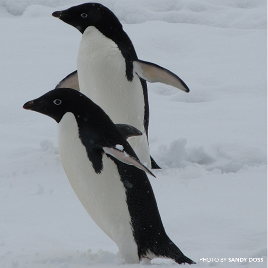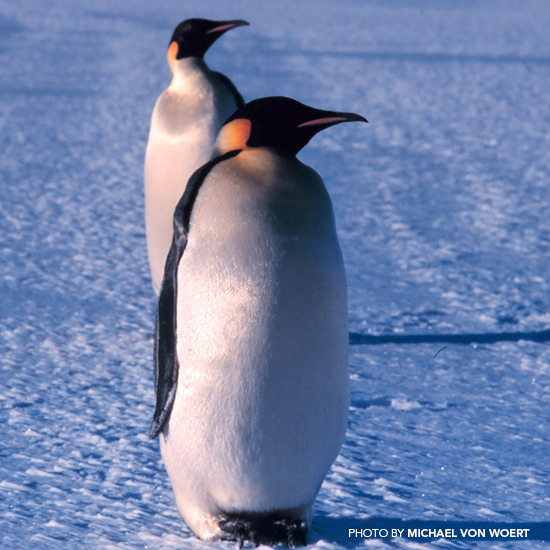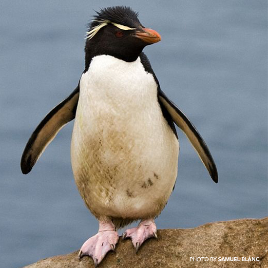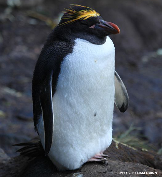 Smaller and more aggressive than Macaroni penguins, Rockhopper penguins earned their name by hopping from one boulder to the next in their rocky colonies. Although their tasseled feathers resemble those of Macaronis, Rockhoppers’ tassels do not meet between their eyes but merely extend along the sides of their brows. Perhaps the most expressive of all the Antarctic penguins, Rockhoppers emit loud cries called “ecstatic vocalization” in addition to using head shaking, waving, bowing, gesturing, and preening to communicate.