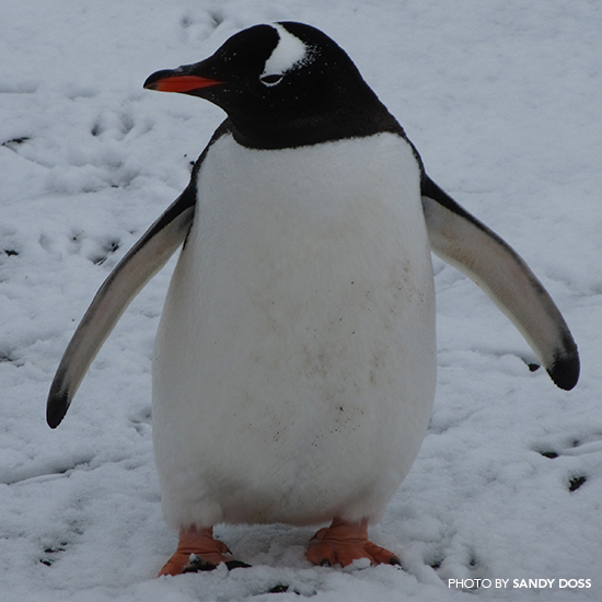 Gentoo penguins love to strut. Their prominent tails, vibrant red-orange bills, and white patches above their eyes make them one of the most aesthetically pleasing species of penguin. At sea, Gentoo penguins frequently form “rafts” of individuals to help one another catch prey. They prefer grass and vegetation to build their nests and tend to fight for supplies during times of scarcity.