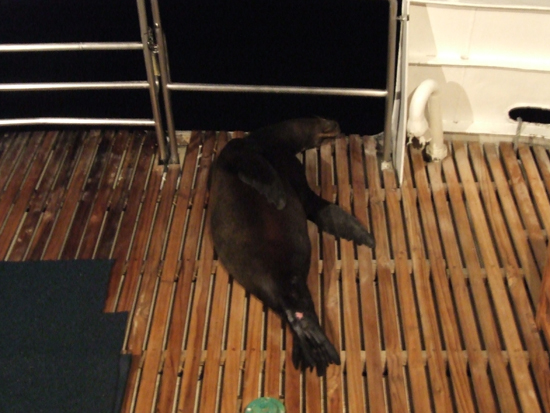 In many of the islands, sea lions lie anywhere they please, but one particular female sea lion felt the deck of the boat Hare and her group was sleeping in was just the right spot for a nap.