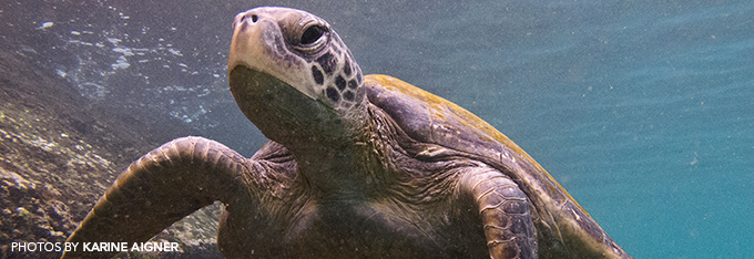 Professional nature photographer Karine Aigner recently returned from a photography expedition in the Galapagos Islands. Among her highlights were close encounters with sea turtles. Her experiences are shared below.