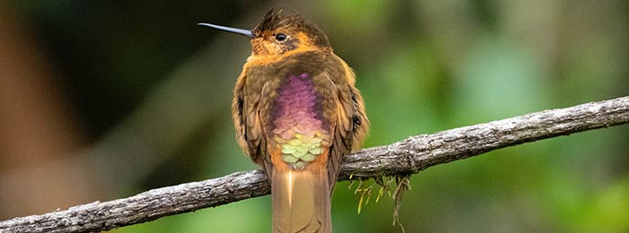 Shining Sunbeam, a large high-elevation hummingbird that shows its rainbow display on its back. I photographed this individual at Yanacocha Reserve, Ecuador during the Hawks Aloft, Inc. trip to Ecuador and Galápagos Archipelago in June 2024. Photos and story by Gail Garber | Hawks Aloft, Inc....