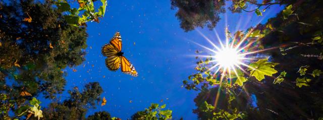 In the high mountains northwest of Mexico City, monarch butterflies return year after year to winter in the pine forests at 10,000 feet. They spend the night covering the trees in huge clusters. They are thought to do this to maintain body heat. When the sun rises and hits the colonies with the day’s first warm rays, the monarchs cascade off the branches and spend the rest of the day gliding through the forest. We were lucky enough to have access to a glade that offered perfect views to a clear blue sky with millions of monarchs swirling through the air. This view through a fisheye lens told the story of that dance.