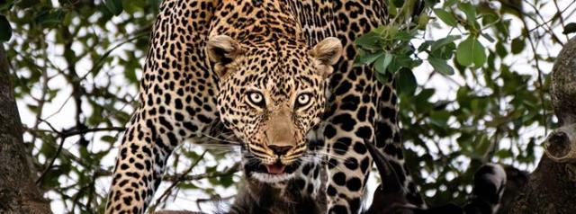After several trips to Africa, I had still never seen a leopard. Being the hardest of the big cats to find, it was not very surprising but was still a goal for this trip to Kenya. My group I was leading told our guide that we wanted to see all of the big cats on this trip, and as we arrived in the Maasai Mara he got word of a leopard being spotted in the area. As we arrived just before sundown, we saw a tree with a wildebeest carcass hanging in it, a sure sign that a leopard was nearby. As we were losing light, we positioned ourselves for the best possible angle and waited, hoping that the elusive cat would make an appearance before we were required to leave. Visitors must leave before dark and the ranger started to flash his lights, telling us it was about time to head back. Just then, movement in the grass gave us hope. The leopard emerged from the tall grass he was hiding in. He quickly made his way into the tree and began feeding on his prize. We were able to make a few photos before it was time to say goodnight. It was truly a gift to be in the presence of such a magnificent cat.