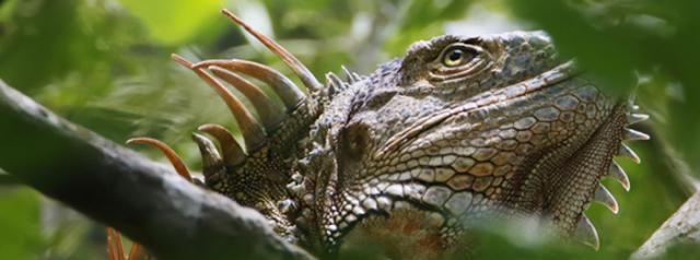 While exploring along the above ground pathway at Aninga Lodge, set in the wilds of Tortuguero, Costa Rica, the rustle of leaves and movement in overhead branches caught my attention. Could it be one of the many species of beautiful birds, one of the several species of monkeys, a shuffling sloth? Closer observation soon revealed that it was instead a very large Green Iguana lizard surprisingly quite nimble in its lofty perch. We had recently arrived at this jungle paradise after a breathtakingly scenic hour long boat ride on the river.